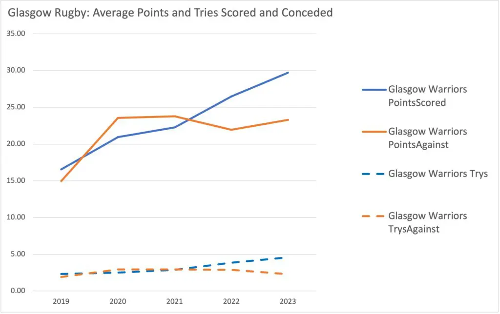 Glasgow have seen perhaps the most significant year-on-year improvement and are now scoring at almost double the rate per game than they did in 2019. Glasgow have developed a dynamic and attacking style of play that utilises quick rucks, offloads, and expansive back play to stretch the opposing defences and keep the scoreboard ticking.