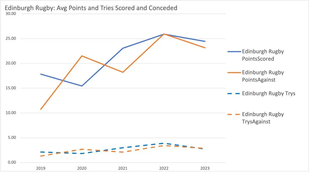 Edinburgh too have increased their average score rate, though not to the same extent as their Glaswegian rivals. Buoyed by performances of back-three Emiliano Boffelli, Darcy Graham, and Duhan van der Merwe, Edinburgh have adopted a similar attacking approach, centred in the free-flowing style of play seen in the Southern Hemisphere game and in using penalties and drop goals to keep the scoreboard ticking. This season so far, Edinburgh have attempted six drop-goals and 16 penalty kicks – both significantly higher than their Glaswegian counterparts.